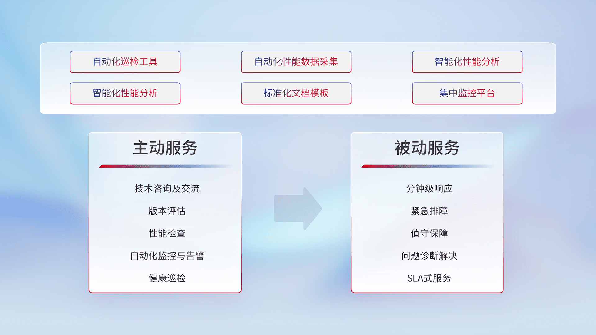 智能化工具和标准化文档,,,保障服务质量,,,,提供主动服务(包含技术咨询、、、、版本评估、、、、性能检查、、自动化监控与告警、、、健康巡检)和被动服务包含(分钟级响应、、紧急排障、、、、值守保障、、、、问题诊断解决、、、、SLA服务)。。。。
